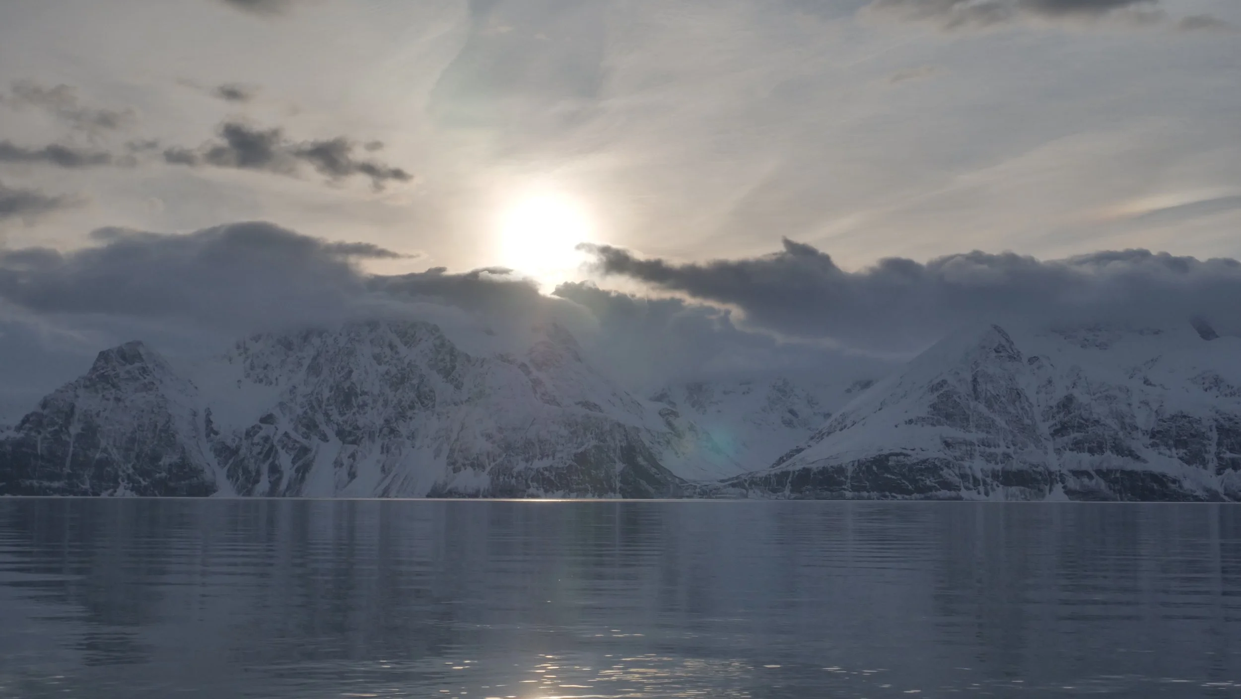 I’m looking out at the snowy mountains once again. There is a long sheet of ice in the water, and the loyal gulls are following our boat again. Very few clouds are out. I see a blue sky. Today blues are more prevalent than whites. Between the blue sky and the blue sea is the white snow and mountains. Impossibly, perfectly framed.